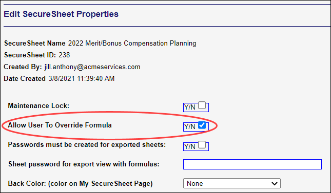 If you need to allow users to override formula-driven columns in SecureSheet, you must set the property that allows them to override formulas. This is set per SecureSheet.