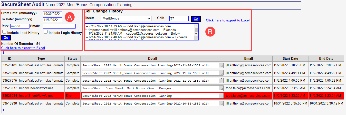 - You may export the Cell Change History audit by clicking the Click here to export to Excel link.