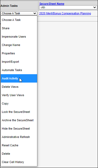 A SecureSheet-specific audit can be accessed by selecting Audit Activity from the Admin Tasks drop-down next to the SecureSheet you want to audit on your SecureSheet Home Page: