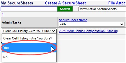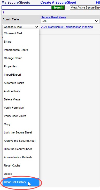 - Select Clear Cell History from the Admin Tasks drop-down next to the SecureSheet that you want to clear.