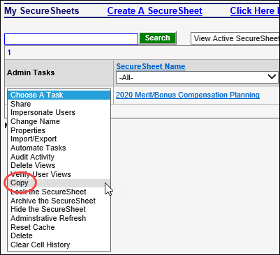 - Select Copy from the Admin Tasks drop-down next to the SecureSheet you want to copy.