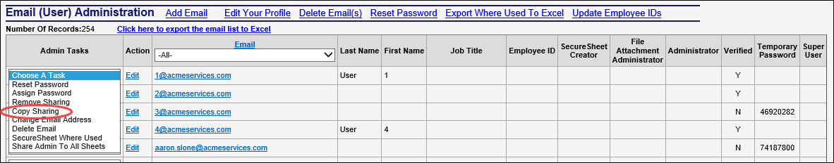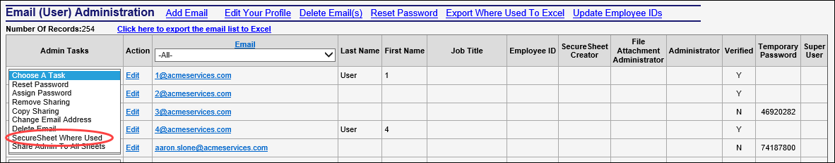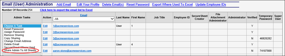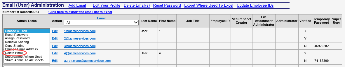 - Select Delete Email from the Admin Tasks drop-down next to the user you want to delete from SecureSheet.