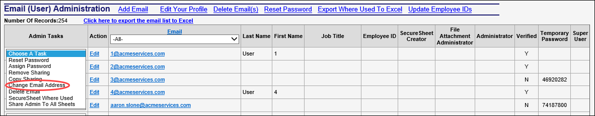 - Select Change Email Address from the Admin Tasks drop-down next to the user whose email you want to change.