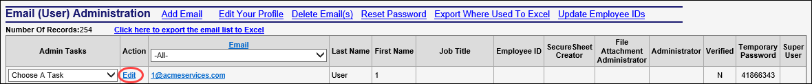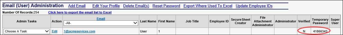 NOTE: You will know when the user has logged in and reset their Temporary Password when the Verified column is Y and the Temporary Password column is blank.