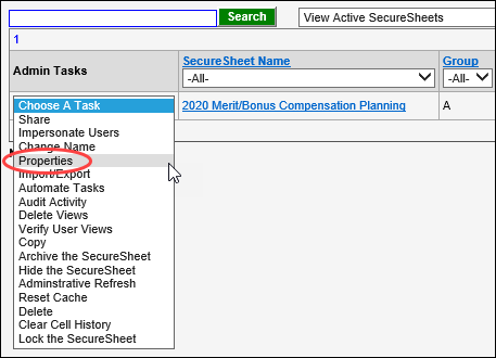 - Select Properties from the Admin Tasks drop-down next to the SecureSheet you want to take off Maintenance Lock.