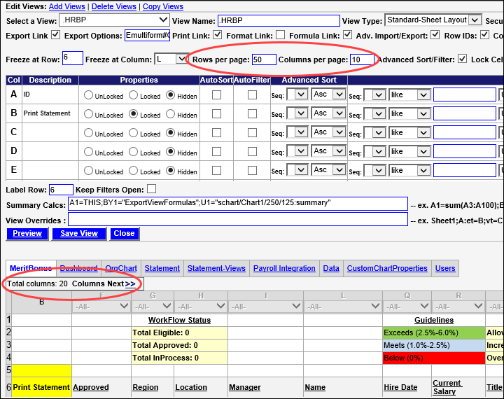 NOTE: Rows per page is 50 and columns is 10, and there are 20 total columns set to be visible (Locked or UnLocked) in this view, which you can see below the tabs in the SecureSheet.