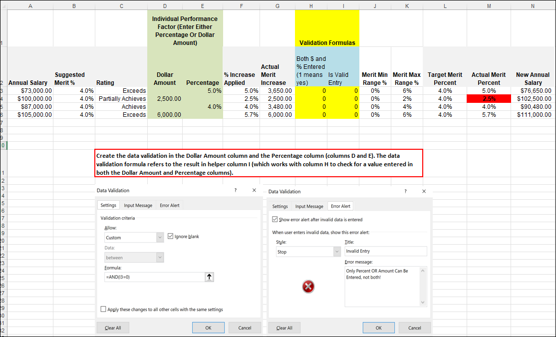 - Check for the results of the helper columns in a data validation in both the dollar amount column and the percentage column and present an error alert to the user if they have entered a value in both columns.