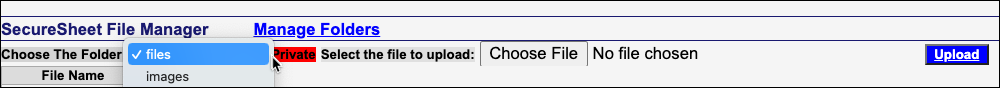 - Select the Files or Images folder from the Choose The Folder: dropdown. This is the folder that you want to upload a file into (Excel or .PDF files into Files, .png or .jpg files into Images).