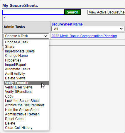 - In SecureSheet, select Verify Formulas from the Admin Tasks drop-down next to the SecureSheet whose formulas you want to verify.